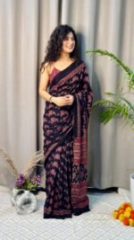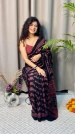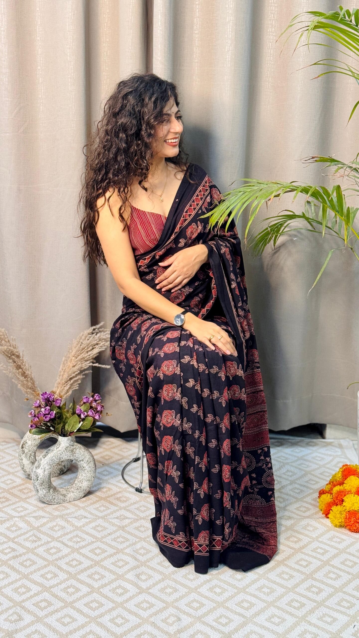 Step into the world of heritage luxury with the Suvira Indrani Ajrakh Hand-Block Printed Cotton Mulmul Saree. Crafted from our signature soft and breathable mulmul cotton, this saree showcases the ancient art of Ajrakh printing. It features intricate floral and geometric patterns in deep madder red across a midnight black base, finished with a traditionally ornate pallu and border.