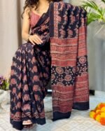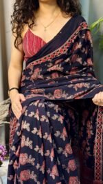 The rich, earthy tones and timeless Ajrakh motifs make it a versatile choice for formal meetings, festive gatherings, evening celebrations, and sophisticated daily wear. Lightweight and exceptionally soft, the Indrani saree is a tribute to the skilled artisans who keep the legacy of hand-block printing alive.