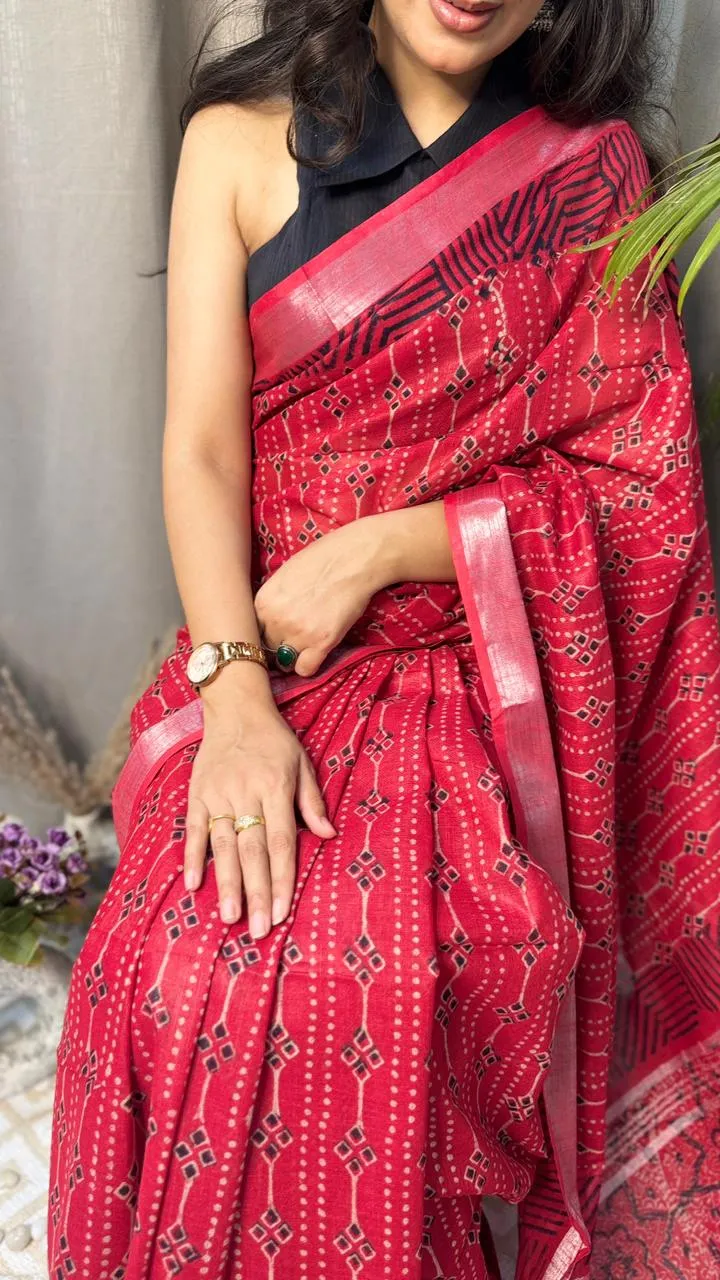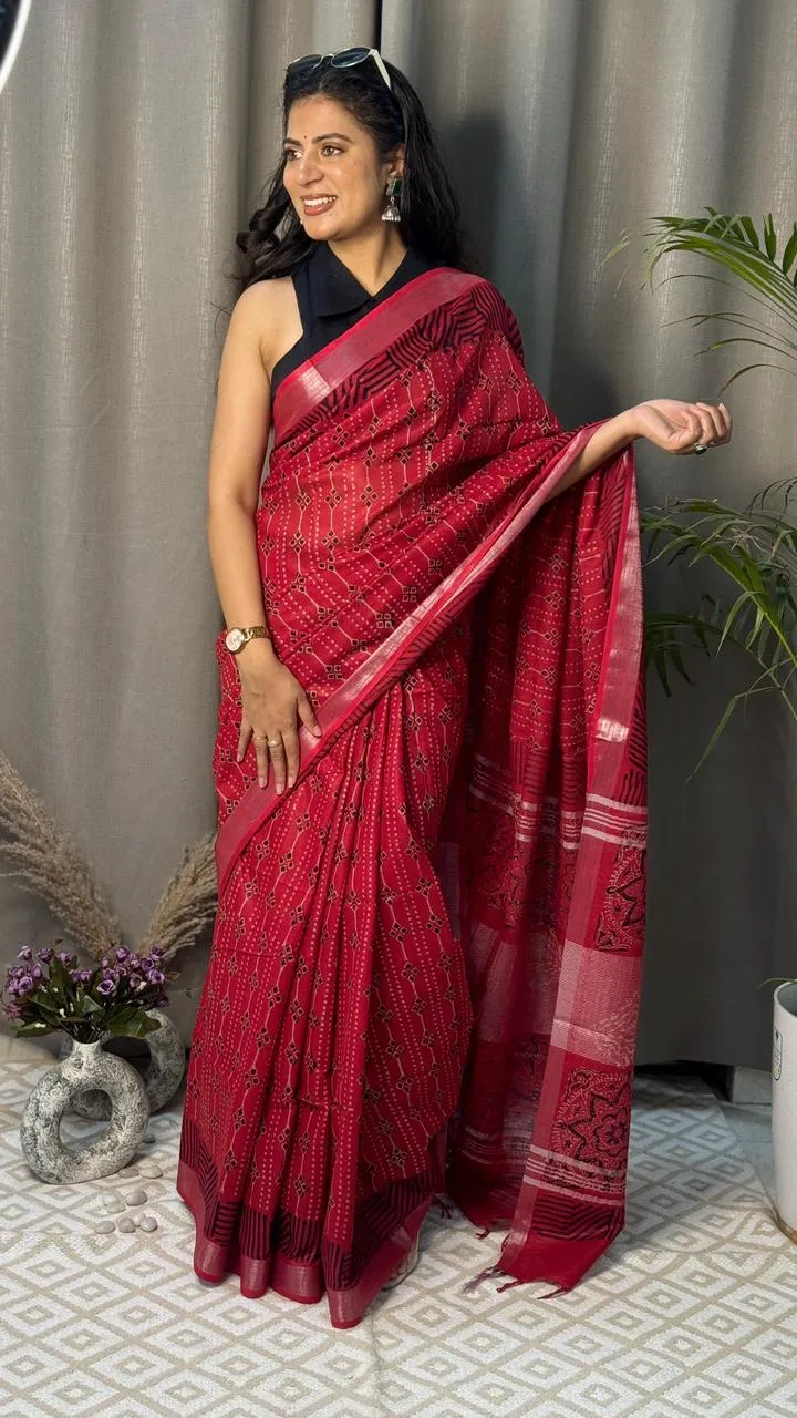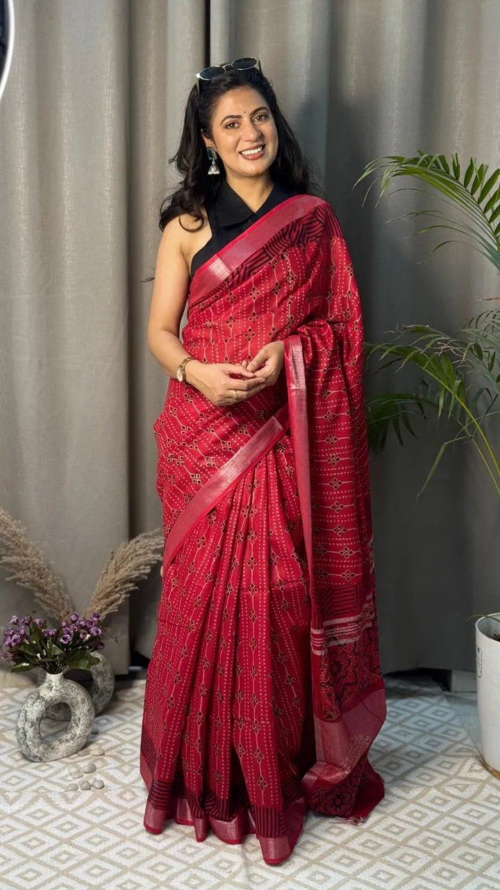Exude regal sophistication with the Suvira Vamika Geometric Hand-Block Printed Cotton Mulmul Saree. Crafted from premium, breathable mulmul cotton, this saree features intricate geometric and floral hand-block motifs in a striking black and red combination, elevated by a sleek shimmering border and a heavily detailed pallu.
